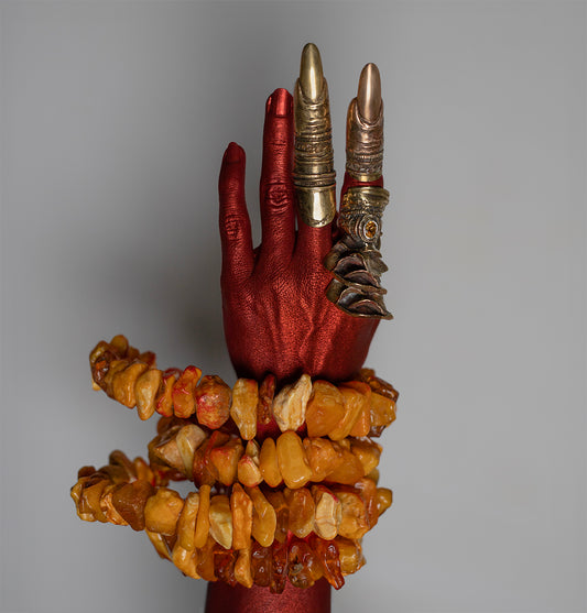 Finger ring with earring. Brass, silver, zircone. / Pierscien palec z kolczykami, mosiadz, srebro, cyrkonia.