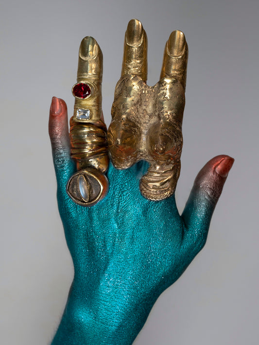 Big Finger Chr with amethyste, garnet. Brass. / Pierscien palec. Mosiadz, ametyst, granat.