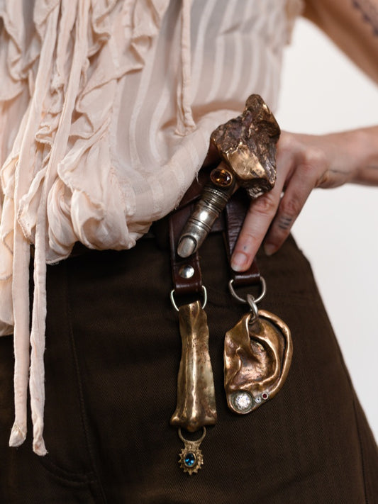 Ear pendant. Bronze, zircons, garnet. / Wisior w kształcie ucha. Braz, cyrkonia, granat.